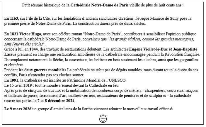 Ensuite, c’est la visite tant attendue. Nous ne sommes pas seuls dans la Cathédrale, beaucoup de personnes (11 millions en 2025) tiennent à admirer cette merveille d’architecture. Certains d’entre eux y cherche les traces de Quasimodo et d’Esméralda nous dit notre guide… Mais il ne faut pas oublier que nous sommes dans un lieu de culte, tout nous le rappelle. La flèche qui s’était écroulée dans la nef, s’élève de nouveau à la gloire de Dieu. C’est la clarté qui impressionne :
